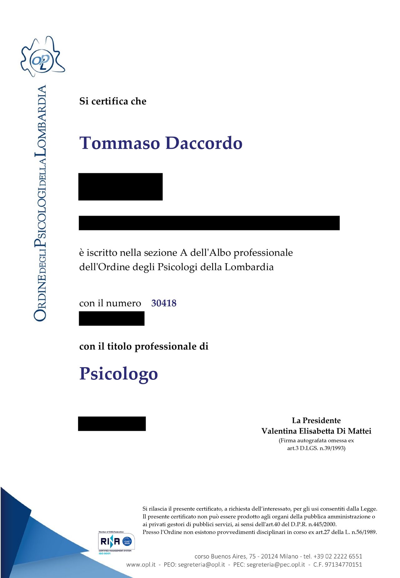 Sono il dott. Tommaso Daccordo, psicologo e psicoterapeuta in formazione presso la Scuola di Psicoterapia Integrata (SPI) di Milano. Ho conseguito con lode la Laurea Magistrale in Psicologia Clinica e Neuropsicologia nel Ciclo di Vita presso l'Università degli Studi di Milano-Bicocca.